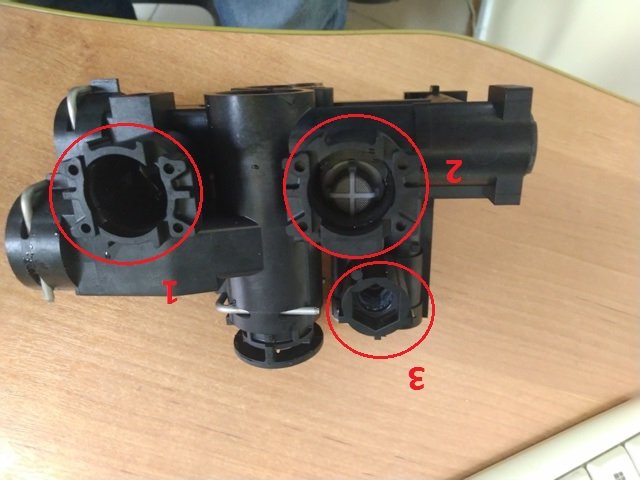 Между ними (не стал отмечать) крепёжное отверстие правой стороны теплообменника ГВС. Крепёжный винт заводим с передней стороны группы (на первой фотке отверстие не видно за картриджем трехходового клапана). Теплообменник просто прижимается данным винтом к прокладкам, установленным в (1) и (2).