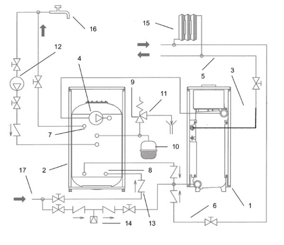 Бойлер подключен к котлу с помощью гидравлического комплекта, который указан в инструкции к бойлеру. Реализована схема подключения со страницы 7 инструкции к бойлеру.