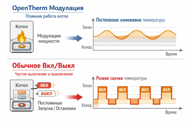Если OpenTherm нет, обычный режим включения/выключения — котел всегда работает на полную мощность и потом отключается, — именно это быстро изнашивает котел. Поэтому термостаты без OpenTherm иногда могут работать в режиме, который «портит» котел, а панели вроде Smart Link с поддержкой OpenTherm наоборот сохраняют ресурс котла. <— Вот так говорит ИИ.