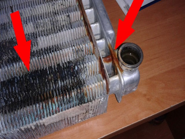 Добрый день. Имеем следующие: Luna 3 310, срок эксплуатации - 6 месяцев. Причина обращения - бежит вода из котла. После вскрытия оказался потекший основной теплообменник. Место утечки отметил стрелкой - на подаюющем контуре. Так же стрелкой отметил сильный прогар теплообменника именно в этой части, а не по всей поверхности теплообменника, что характерно. Прогар настолько сильный что ребра практически разрушены.