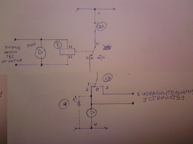 а я в своей теме тоже навелосипедил подобную схему.. надо же так не заметить!electric писал(а): По просьбе ТС нарисовал схемку включения насосов СО через реле. Реле (К) включается параллельно насосу ГВС. При включении насоса ГВС, включается реле и разрывает питание от автомата (QF). После реле я нарисовал переключатель (SB) на 3 фиксированных положения. В положении (1) насос (в самом низу схемы) будет молотить и ныне и присна и во веки веков. В положении (0) будет, соответственно, выключен. В положении (А) будет включаться в автоматическом режиме от исполнительного устройства, предположительно от комнатного термостата.
