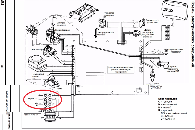 На схеме электрических соединений котла BAXI место подключения датчика температуры понятно. Не ясно место подключения проводов термостата. На схеме есть обозначение "ТЕРМОСТАТ", но какой провод куда подключать не понятно. Там есть клема 1-напряжение при НЕ нагретом водонагревателе и клема 2-напряжение при нагретом нагревателе.