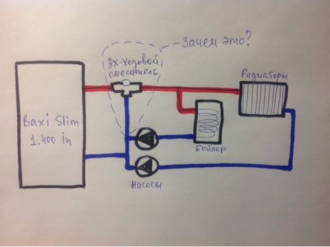 Смонтировали систему отопления, котел Baxi Slim 1.400 In. Все работает на мой взгляд хорошо, однако не могу понять зачем сделан узел подмеса (3х ходовой смесительный клапан). Теплых полов у меня нет, одни радиаторы. Может я что-то упускаю и подмес может быть полезен? У меня кран все время в крайнем положении, я его не трогаю потому что не понимаю зачем он нужен в моей схеме. Может чего не догоняю, подскажите, плиз.