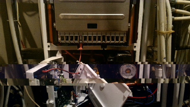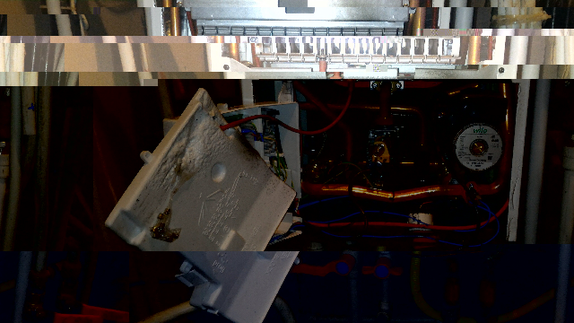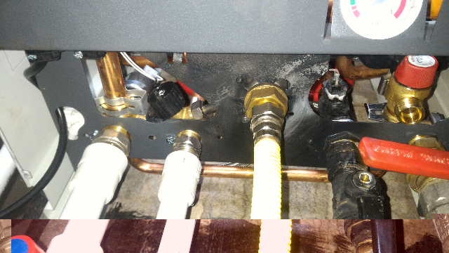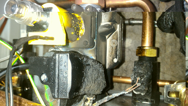 Когда горело, все было закрыто кожухом. Пылало и внизу корпуса и по бокам. Я сначала подумал, что мастера плохо припаяли трубы, но с ними все оказалось хорошо. Центр возгорания между насосом и газовым клапаном, там к элементу два черных провода идут. Им и элементу (байпас?) хана. Еще обгорел разъем с толстым черным проводом на газовом клапане.