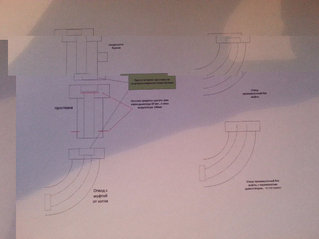 Проблема в том что отвод с муфтой и конденсатосборник оба присоединяются к котлу, но не стыкуются друг с другом.