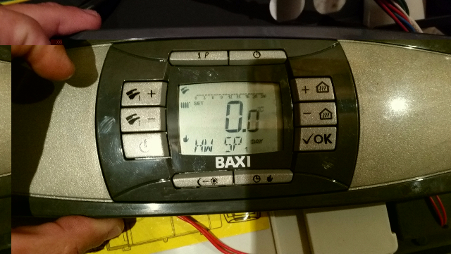 2. Пытаюсь запустить Газовый котел. Поставил перемычку вместо комнатного датчика (кстати только после этого котел при включении эл. стал насосом гудеть). Вроде включаю все и отопление и ГВС. Котел молчит. Открываю кран горячей воды - на гвс тоже не запускается. Что горит на дисплее видно на фотке. Пытаюсь поднять температуру на ГВС кнопками +/-. На минус кнопка уменьшает, а вот на плюс нажимаешь а температура выше не ставится. Только на уменьшение (кнопка физически рабочая т.к. в других режимах она отрабатывает). И такая фигня и на кнопке +/- ГВС и на кнопке +/- где домик. Т.е. вниз температуру я убавил, а вверх - фига.