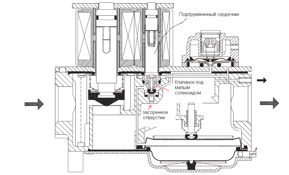 внутри малого соленоида (малого электромагнита) подпружиненный шток в своем корпусе вынется из соленоида целиком и возможно останется на клапане.