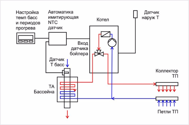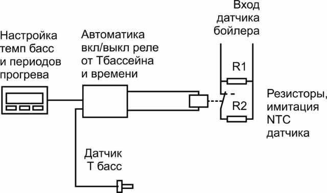 Автоматика приоритета подогрева бассейна внешняя с имитацией термодатчика бойлера (по температуре + ограничению времени подогрева бассейна).