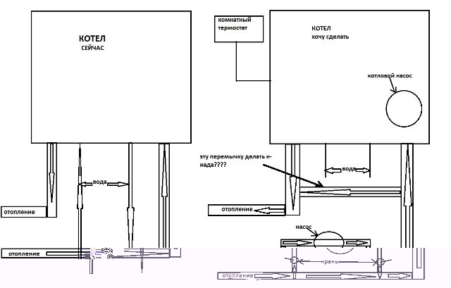 В доме установлен BAXI MAINFOUR 240F. Задумался над незначительной модернизацией системы отопления, дабы есть желание при меньших затратах на газ получить большую отдачу. Дом покупал готовый. В доме присутствуют теплые полы, отдельных термостатов и насосов на ТП нет. По факту отопление работает вполне сносно, единственное. в двух дальних комнатах второго этажа, которые идут в конце контура отопления, батареи немного прохладнее. Схему отопления описать не смогу, ибо данных нет. Прилагаю рисунок того, что я хочу сделать. Предполагается установка комнатного термостата и дополнительного насоса большей мощности (прокачка 150-200 л/мин). Доп.насос будет работать на постоянке независимо от работы котла. Так как термостат при достижении необходимой температуры полностью отрубает котел, в том числе и встроенный насос, есть опасение, что полы будут быстро остывать и затем будут дольше прогреваться (по полу проложено примерно метров 80 трубы). Соответственно, хочу доп. насос поставить чтобы теплоноситель все время циркулировал по системе, ну и благодаря большей скорости прокачки предполагается большая теплоотдача ибо доходя до котла теплоноситель не будет сильно остывать.