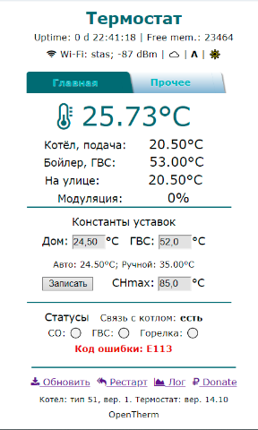 Baxi Slim 1.400 + Zont H1B (OpenTherm) выдает e113, до этого было месяц назад -сбросился штатным способом.