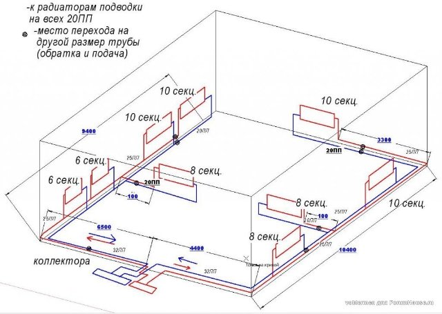 Отопление сделано алюминиевыми радаторами. Схему прикладываю. Если вкратце, то в котельной собран коллектор из 40 полипропилена и далее от него идёт 2 ветки на дом двухтрубкой.