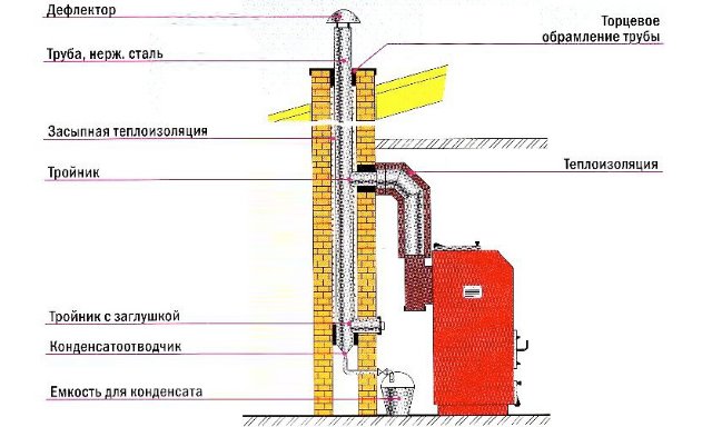 Два метра от котла вертикально , отвод 90 градусов, метр трубы , тройник , 6 метров на крышу.