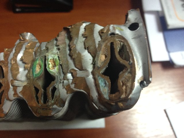 А если такой реагент есть у наших газовиков, стоит ли им отдать ТО на промывку к ним в мастерскую, перекантуемся как-нибудь денёк без воды.Olegbez писал(а): Промывка битермика - неочем. Там трубки не зависимой веткой идут, а параллельной. И что? скажешь ты. А то что если ты промоешь - то только короткий путь, остальные трубки забитые впритык ни одна кислота не смоет. Факт. Нужна мощная кислота типо соляной. Мы моем 80% реагентом Atlas Dical, не знаю есть ли он у вас. Фото глянь, мы его разрезали после 2 часовой промывки кислотой. То что забито впритык не пробить раствором. Лучше на новый котел смотреть, так как вкладывать в полутруп дело затратное. После теплообменника заменой пойдет вентилятор и насос.
