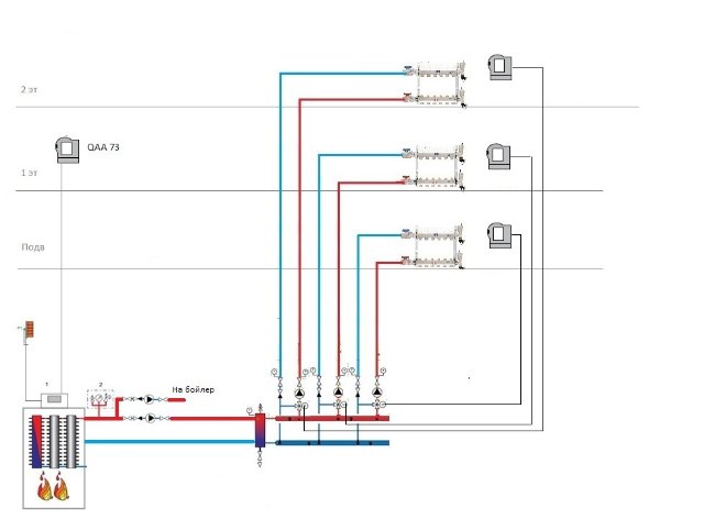 - 3 контура отопления со смешением, управляются термостатами на этажах.
