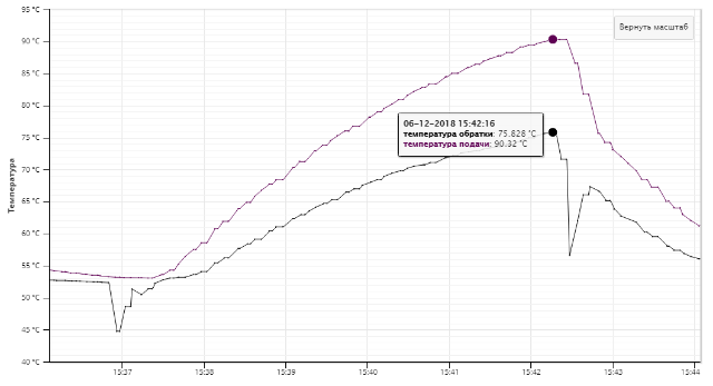 Отбор мощности виден по падению обратки,в этот момент отключился насос ГВС и включился насос СО.
