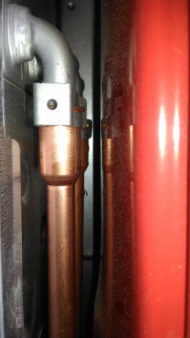 Дернули или наперекос соединение (тянет в сторону). Надо смотреть куда нагрузка, можно скорректировать трубкой котла (подогнуть внизу перед выходом из корпуса).