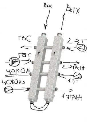 plehan, ВѣреярЪ, Касаемо промывки и теплообменника совет понял. Касаемо гидравлического разделителя. Посмотрел в инете. Судя по всему у меня он установлен, и насосы стоят отдельно на каждую из четырех линий (контуров), но теперь думаю что неправильно подключили систему. Смотрите: непосредственно к Baxi подключен гидро-распределитель. (Попытаюсь прикрепить картинку) А вот к нему подключены контуры, но по принципу (слева против часовой стрелки см. картинку): Вход ГВС - Выход ГВС, Вход цоколя -выход цоколя, Вход 1этаж - выход первый этаж, вход второй этаж - выход второй этаж.