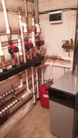 2. С этого коллектора идет подача на 3 контура - первый этаж, мансарда и ГВС. На первом и мансарде - свои коллекторы. Малые - коллектор первого этажа виден на картинке - блестящий. От них на каждую батарею - свой луч. (Наверно система - коллекторно-лучевая)