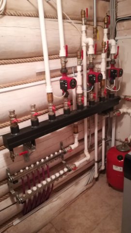 2. С этого коллектора идет подача на 3 контура - первый этаж, мансарда и ГВС. На первом и мансарде - свои коллекторы. Малые - коллектор первого этажа виден на картинке - блестящий. От них на каждую батарею - свой луч. (Наверно система - коллекторно-лучевая)