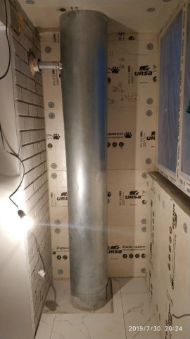 проведешь серой канализационной трубой по стене за серебристым большим дымоходом и закроешь чем-нибудь потом, хламом, полками шкафчиками