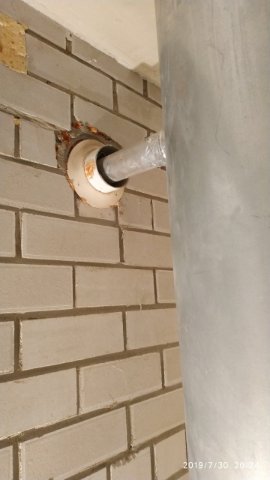 Думал зашить трубу в короб из гипса, подвести в него трубу через окошко в кирпиче.