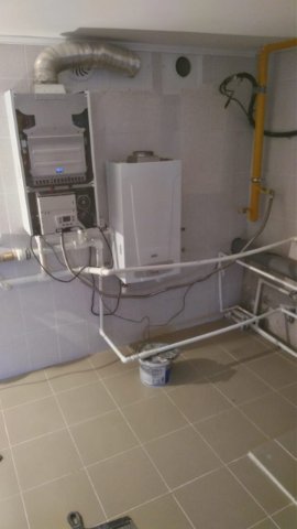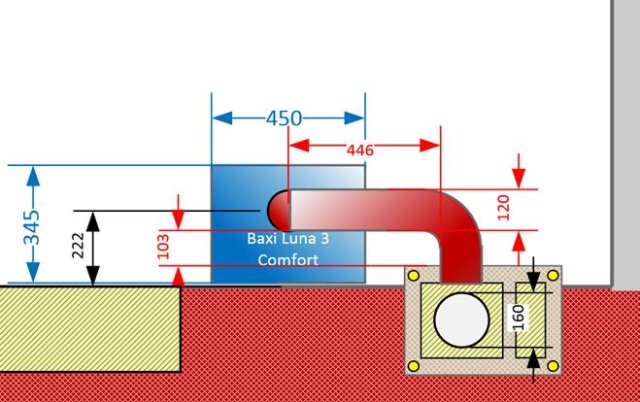 2. Сам котел после обсуждения с монтажником системы отопления решили повесить на стену на которой выход из шиделевского дымохода (картинка ниже). Получается вертикальный разгон 40 см, затем поворот на 90 градусов в горизонталь параллельно стене, потом второй поворот на 90 градусов уже в основной дымоход.