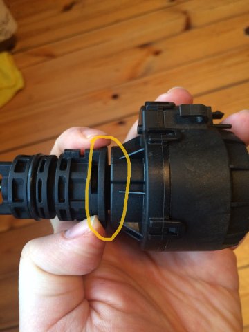 Что бы не пилить шток или паз в моторе (ценники ж не гуманные), можно толщиной фиксатора попытаться отрегулировать положение мотора. Но нужен ещё один фиксатор, а то вдруг в процессе подгонки вылезет истинная причина. Между мотором и корпусом, думаю можно, положить шайбы, вырезанные из пластиковых бутылок, что бы мотор не проваливался глубже и не болтался. Набрать нужную толщину, но что бы фиксатор входил.