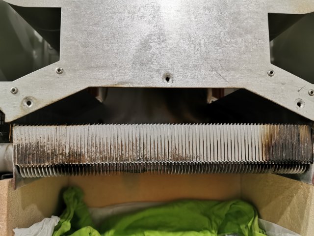 Если совсем чистоты хочется, снимаю вентилятор и верхнюю крышку камеры сгорания, стелю на полиэтилен тряпку (и закрываю боковые стенки камеры полиэтиленом), брызгалкой поливаю радиатор и почесываю его щеткой. Но без фанатизма с водой.