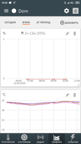 В принципе система работает, но не совсем так, как ожидалось. Что в обычно, что в псевдорелейном режиме старает температуру теплосителя загнать на максимум, а потом нещадно тактует с частотой 3 минуты. Т.е. 3 минуты котел работает, потом на 3 минуты выключается, потом снова включается.