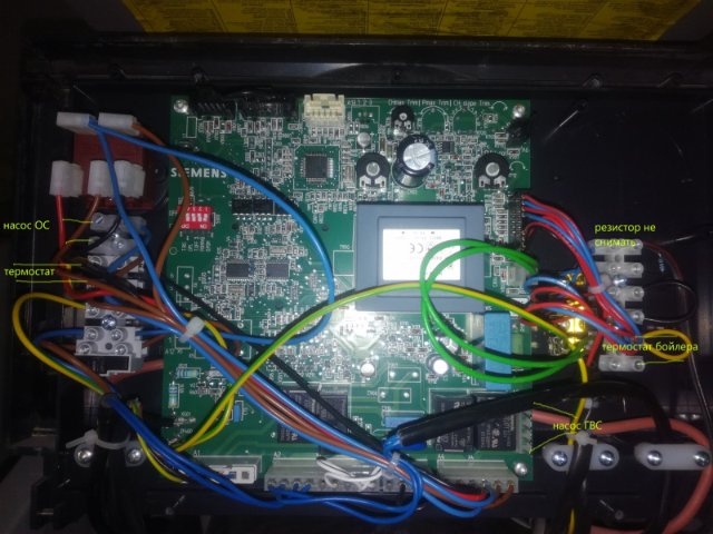 Как я понял, можно все сделать от термостата бойлера: НЕ подведить 220В к бойлеру (лампочки не главное) и протянуть проводов от термостата бойлера к зажимам 5 и 6 разъема М2 котла (там, где стоит перемычка по умолчанию) + подключить насосы (бойлер и контур радиаторов) к котлу. (при этом резистор в клеменной колодке оставить).