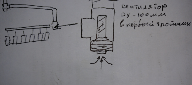 и наверное будет лучше корпус вентилятора вынести из тройника а оставить в тройнике только патрубок подачи воздуха. Эжектирующий вентилятор в щадащих для него температурах будет и удобнее обслуживать.