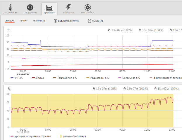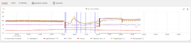 По графикам от контроллера , в случае с управлением по шине, целевая температура ПЗА не отображается. В релейном режиме этот график есть. Т.е. контроллер по шине не выдает информацию на целевую температуру. Очень измотался за два дня. Прикреплю график, на котором видно, с 13.00 до примерно 16.00 пытался использовать шину управления.
