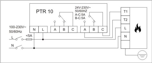Судя по схеме, у термостата свои 220в, которые управляют релюхами, контакты реле свободны от напряжения, т.е. работают перемычкой.