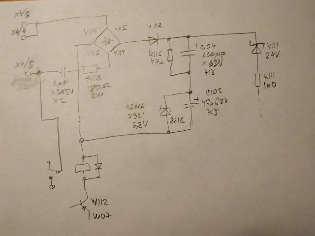 . Сколько успел. Резистор, как я и предполагал -гасящий. Как и предполагал tsv63, случился обрыв стабилитрона V111. Опять же под рукой оказались только 12В стабилитроны. Состряпал из них 24В. поскольку у старого обрыв - припаял прямо поверх. К сожалению на "родном" корпусе стабилитрона MELF нет никакой маркировки. Но, в целом, с его мощностью понятно. Напряжение, измеренное на резисторе R118 до замены стабилитрона около 17-18В (немного скачет) при заменённом - 11,8 (стабильно). Что даёт ток почти 100мА в первом случае и 65мА во втором. Соответственно объяснение перегрева рассеиваемой мощностью: 1,8Вт и 0,77Вт. К этому надо прибавить заметное тепло от котла. Поскольку завершить схему не получилось, остался вопрос: какого хрена? Чтобы глобнулся диод - обычное дело, а чтобы стабилитрон - не совсем обычно. Т.е. вполне возможно, что неисправность где-то ещё есть. Буду наблюдать.