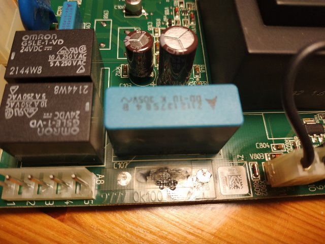 Было предположение, что приказали долго жить электролиты (на ощупь градусов 50°). Оказалось, что все 4 живы-здоровы. Потому, что это хорошие конденсаторы: серия KY (теперь KYA). от 4000 до 10000 часов на 105°С. При ОС 40-50, думаю, 70000часов . А может и больше. Но вообще-то и хорошим конденсаторам через 7-8 лет придёт конец. Очень уж много тепла, да ещё и в невентилируемом кожухе. Мои конденсаторы оказались молодцы: все ёмкости как у молодых (измерял приборчиком хорошим).