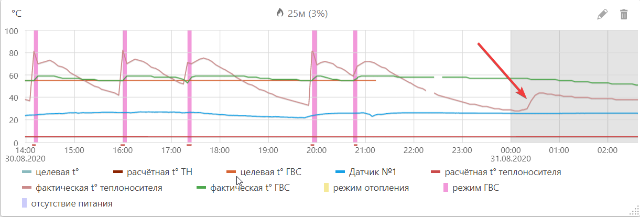 Еще есть вопрос к представителю Baxi, если не возражаете. Вот как выглядит на графике падение температуры теплоносителя по датчику в котле (см стрелку на картинке). Она равномерно падает, но в какой-то момент однократно резко подскакивает. При этом котел не включался, водоразбора не было. И это устойчивое явление. Каждый раз так. Есть ли какое-то объяснение этому пику? Такое ощущение что котел в какой-то момент включает насос ненадолго и прокручивает теплоноситель по системе и на место остывшего приходит более горячий из бойлера. Есть идеи почему так?