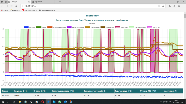 Поставил датчик на внешнюю стену дома. Котел видит датчик, температуру показывает правильно. Длина ПВС 3*0,75 25 метров. 3-й провод не заземлял.tsv63 писал(а): 17 сен 2020, 17:24Лишнее. Схемотехника подобных цепей защищена от помех посредством преобразования сопротивления датчика в ток. На входе АЦП МК есть шунт для преобразования тока в напряжение, а далее МК измеряет уже значение напряжения. А вот, что более полезным может быть в таких длинных цепях, так это большое сечение, рекомендация 0.75 маловата для 20м, максимум 5... У меня 0,75 18м было, заменил на 1,5 акустическим кабелем (но лучше 2,5). Обратите внимание на синюю линию графика, так было, сильно изрезана...2019-11-23_21-26-22.pngЛазарь писал(а): 16 сен 2020, 23:03 25 м ПВС 3*0.75. Есть мысль заземлить один провод для уменьшения наводок.