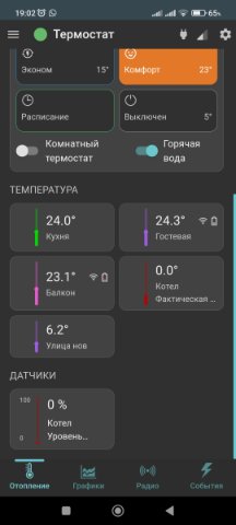 Приветсвую всех! Опять возникла проблема в работе термостата ZONT H-1B. После "летнего простоя" перестал управлять котлом по ОТ. Обычно использовал в режиме работы по цифровой шине с ПЗА и датчиком температуры улицы (его и прописывал в датчиках) для управления. На лето, ПЗА и цифровая шина были отключены, котел работал в ручном режиме с панели как водогрейка. При похолодании запустил его в ручном режиме с панели, затем включил ОТ и ПЗА. В приложении Zont на смартфоне открылись новые окна. Однако расчетная температура 0, температура теплоносителя 0, однако прописывает что Аварии нет. Также, постоянно теряется связь по цифровой шине.