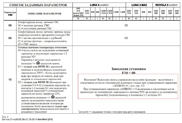 Оказывается при установке рекомендуемого Вами параметра F10=01 отваливается уличный датчик. Этот параметр для "не комфортных котлов" в инструкции написано и я писал выше что f10=1 это для Для DIMS 26 (плата со встроенным дисплеем). Luna 3 и Nuvola 3 серии Comfort имеют DIMS 28 (плата с выносным пультом управления). Поэтому параметр F10 нужно ставить = 02. Из инструкции "F10 = 02 в случае, если к котлу подключен дополнительный комнатный термостат"