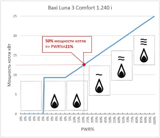То есть, получается примерно такая зависимость мощности котла от параметра PWR % и значка горелки.