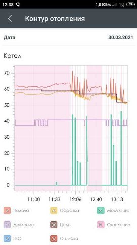 Ну вот, например, позавчера. Несколько часов идеально, несколько часов нулевая модуляция, но греет. Целевая температура понизилась на 1 градус, значит теплопотери менялись за эти часы не очень сильно. А котел ушел из нормального режима в "странный".Starik писал(а): 05 апр 2021, 17:22 Какая потребная (заданная) температура подачи в СО в этот момент? Что от котла требует выполнить тот девайс, который к котлу подключен?