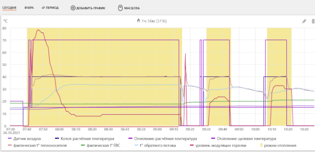В моем случае я покупал что бы дома поддерживать около 15 градусов, а перед выходными поднимать до комфортной температуры, но температура не может ни как упасть до 15 т.к. котел сам включается и греет воздух когда этого не надо. На графиках все видно как включается и выключается.