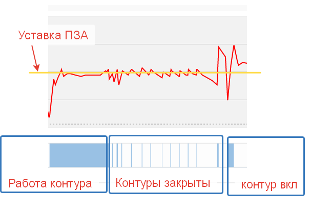 синие полосы - время вкл горелки При открытом контуре (разборе) всё отлично. Котел держит уставку ПЗА (датчик уличной температуры подключен не к котлу, а к системе Эктоконтрол). Участок "работа контура"