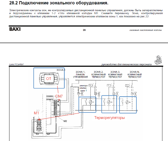 Вы наверное имели в виду 28.2 Подключение зонального оборудования. Я могу ошибаться, но по-моему это не мой случай. Из того, что мне понятно из этой схемы, там подключаются несколько термостатов, и они естественно подключаются к М-1, вместо перемычки. Пока хотя бы один термостат не достиг целевой температуры, он будет замыкать там фазу, и котел будет работать. Когда все термостаты выключатся, фаза разомкнется и котел выключится.