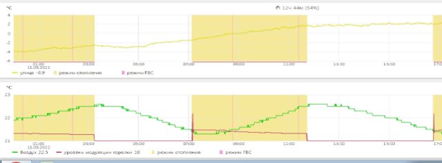 На верхнем графике уличная температура, на нижнем модуляция горелки и температуры воздуха.