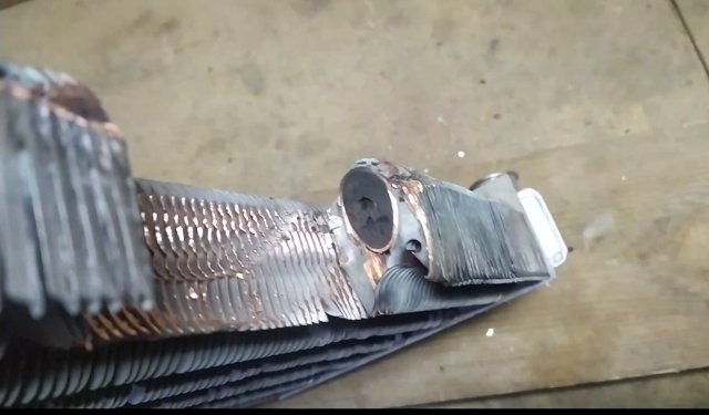 теплообменник медный, проблема в воде, плюс металлический внутри ржавый коллектор, результат на лицо. Завтра пробью теплообменник, поверну его на 180, и думаю до осени будет работать. За лето планирую выкинуть ржавый коллектор, промыть СО и заменить всё на полипропилен. Забита первая трубка, в неё в первую входит теплоноситель вместе со всем мусором, (накипь, ржавчина, +температура).