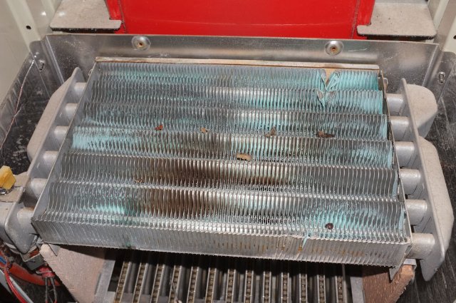 Кроме того, деформированые пластины в разных углах тепелообменника, и справа и слева, причем далеко от центра.