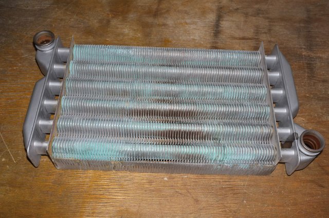 Но, если предположить, что дырку проел именно конденсат, то немного странно, что по остальной площади теплообменника нет ничего похожего на раковины от кислоты.