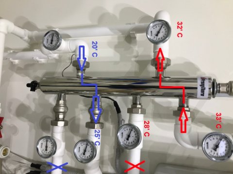 Обратка холодновата, но там надо покрутить Combimix. В него приходит 33 гр.С., электроклапан сняли, вход узла полностью открыт.