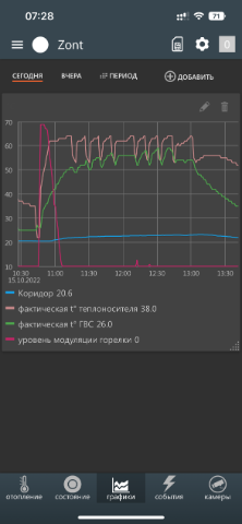 Все время наблюдаю за кривой модуляции. По какой то причине модуляция котла включается только при запуске котла и сразу падает до 0. Даже если котел работает минут 20, модуляция будет 0. Посоветуйте что то можно сделать чтобы модуляция работала.
